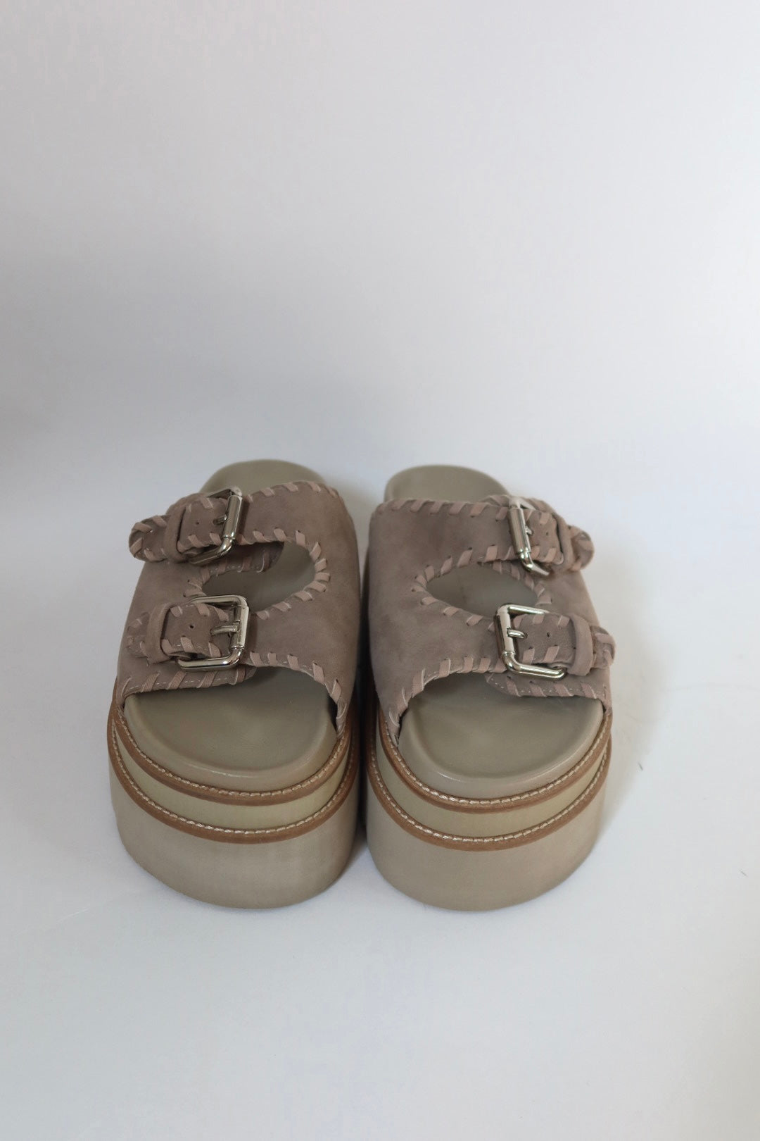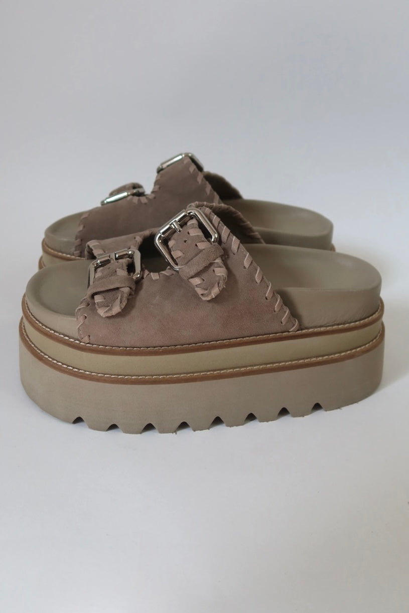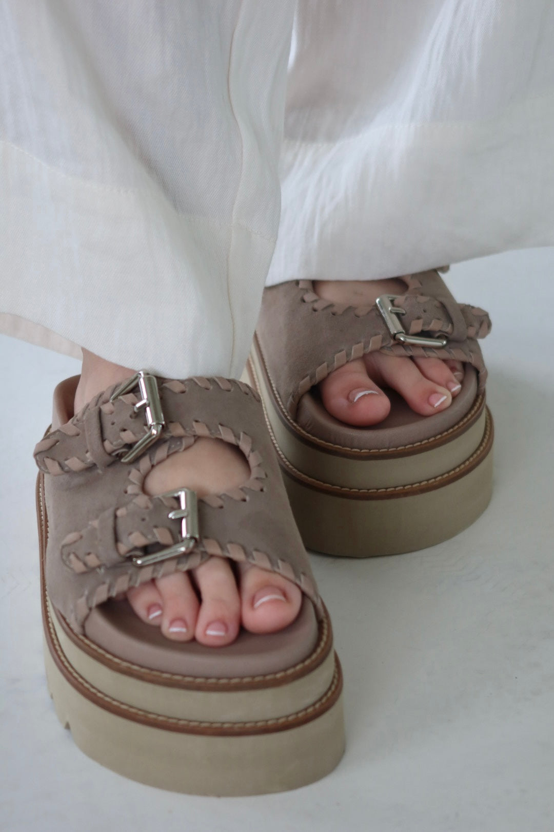 Sandalia de plataforma de 7cm con capellada hecho en 100% cuero textura gamuza detalles de pasador en cuero liso.