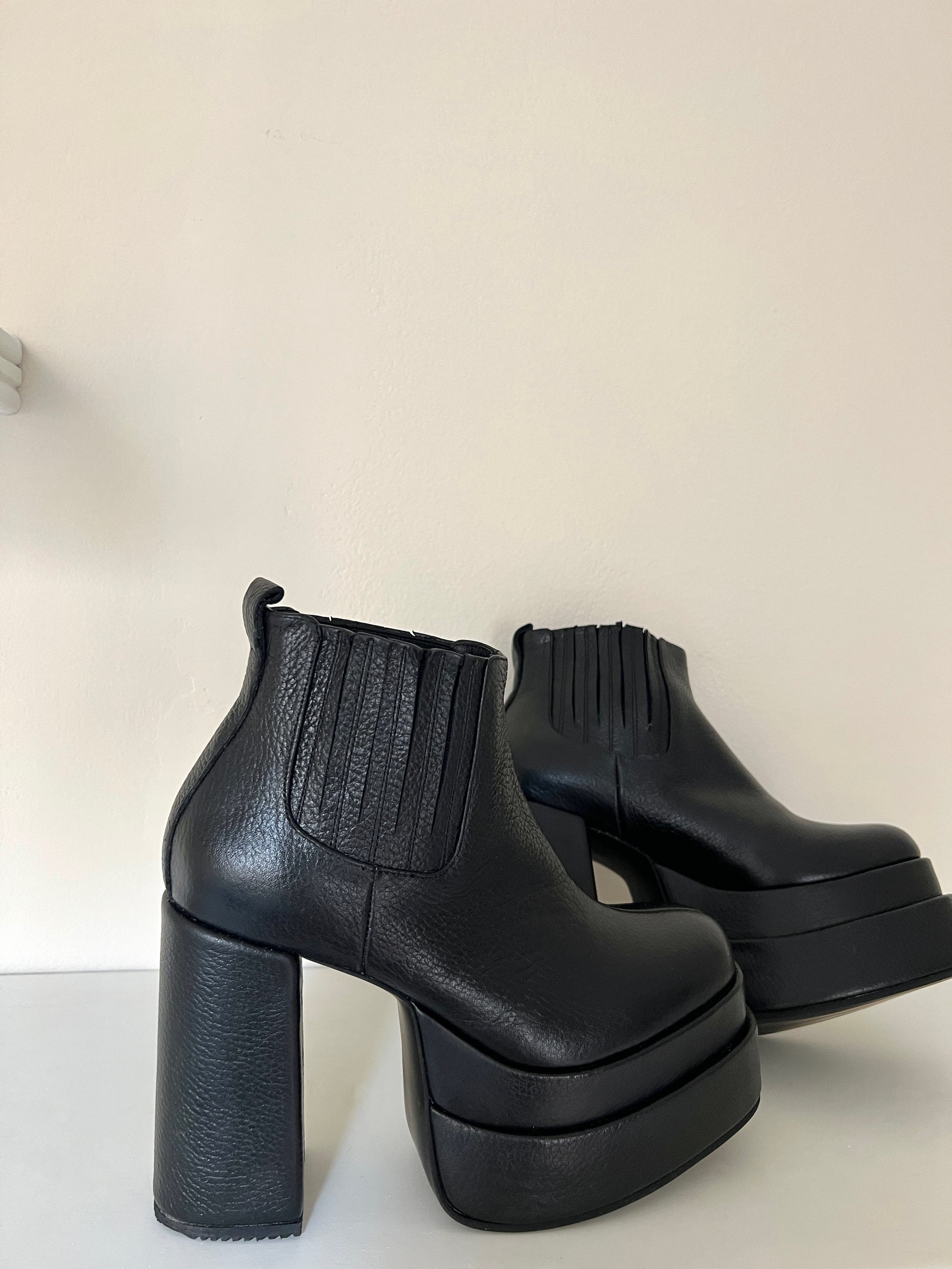 Nuestros botines de doble plataforma, hechas totalmente en cuero floater de color negro (tanto interior como exterior). Planta acolchada ideal para las que aman la comodidad y los tacos altos.