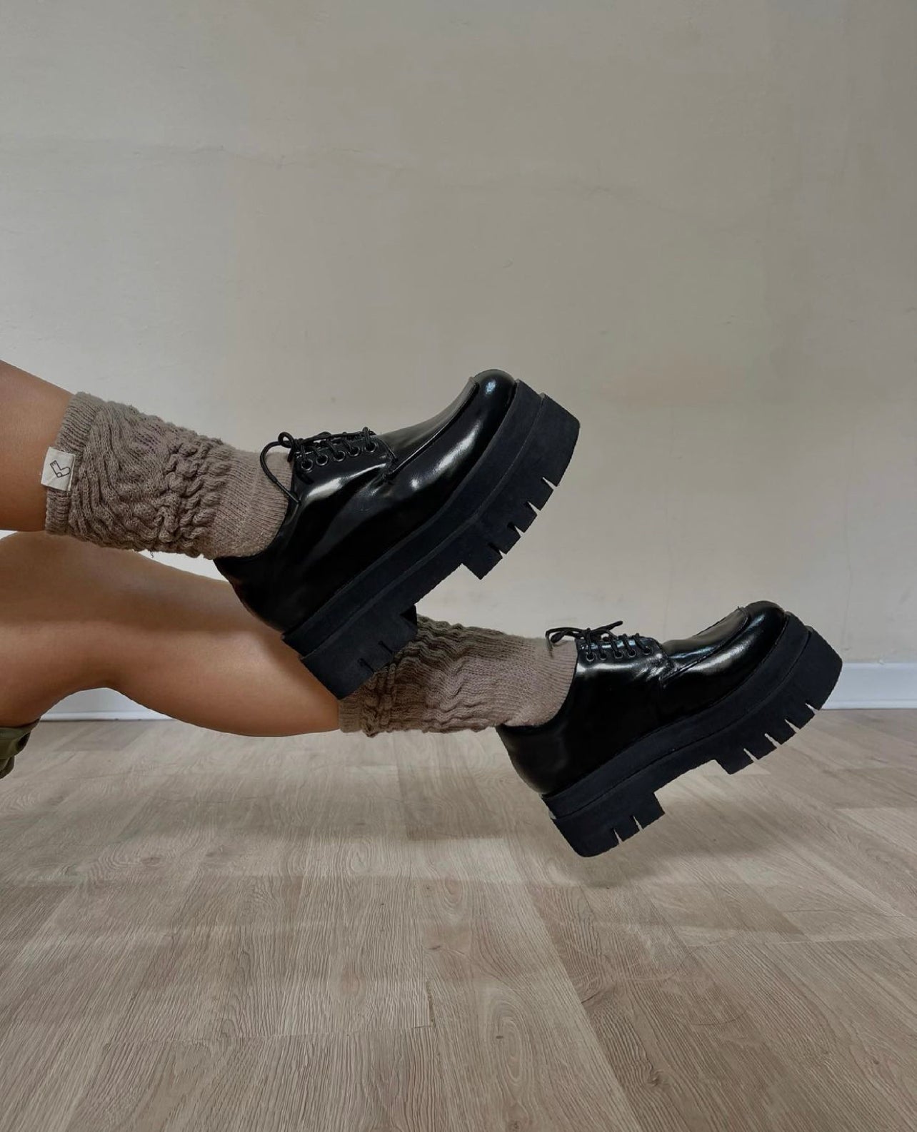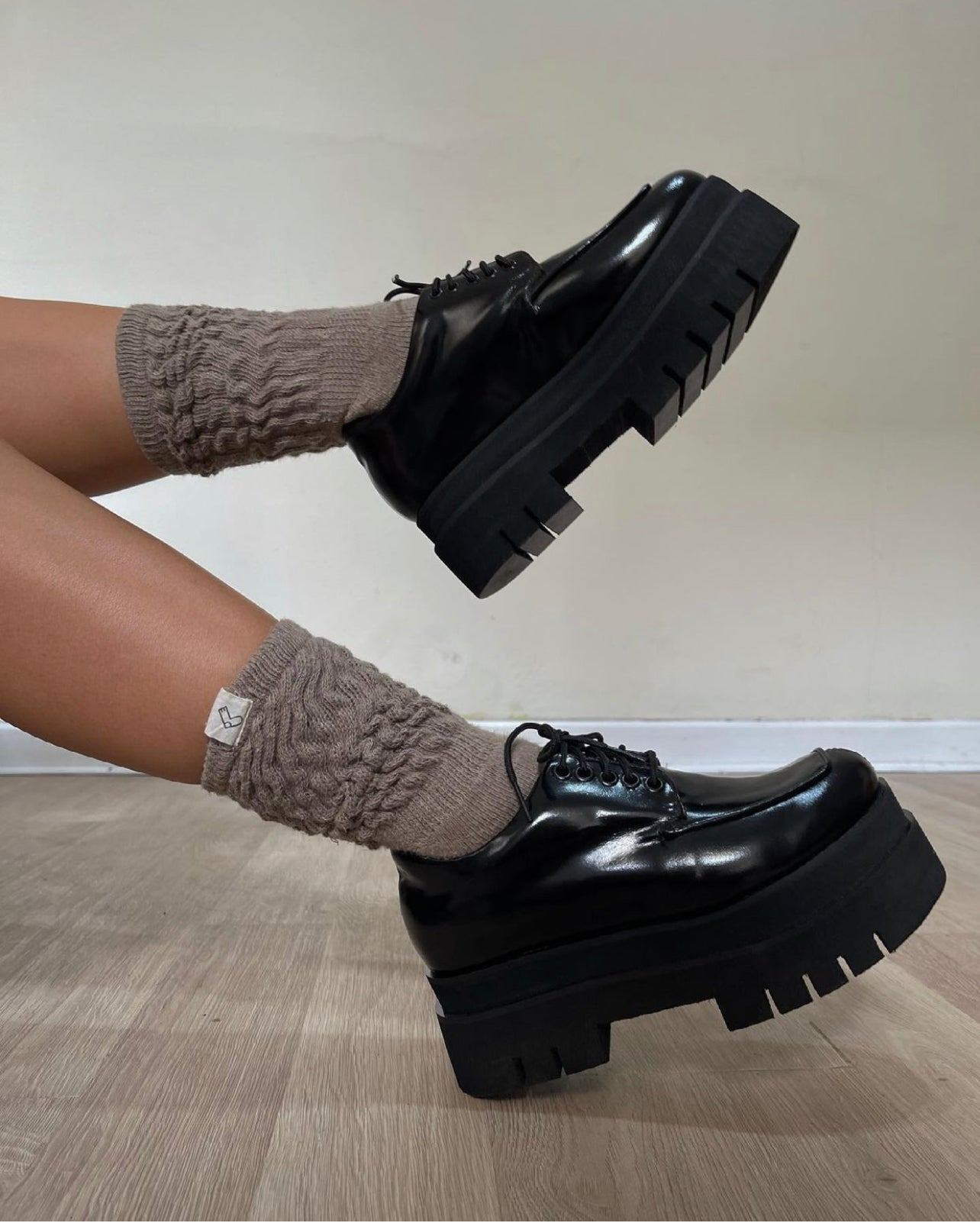Zapatos tipo mocasín de plataforma alta con 8 centímetros. Las levan tienen hasta el más mínimo detalle hecho a mano. La base es de eva, lo que los hace súper livianos y cómodos para caminar con una altura aproximada de 7cm, los dientes son diseñados uno por uno y son exclusivos de la marca. (UNICAMENTE EN PERÚ)