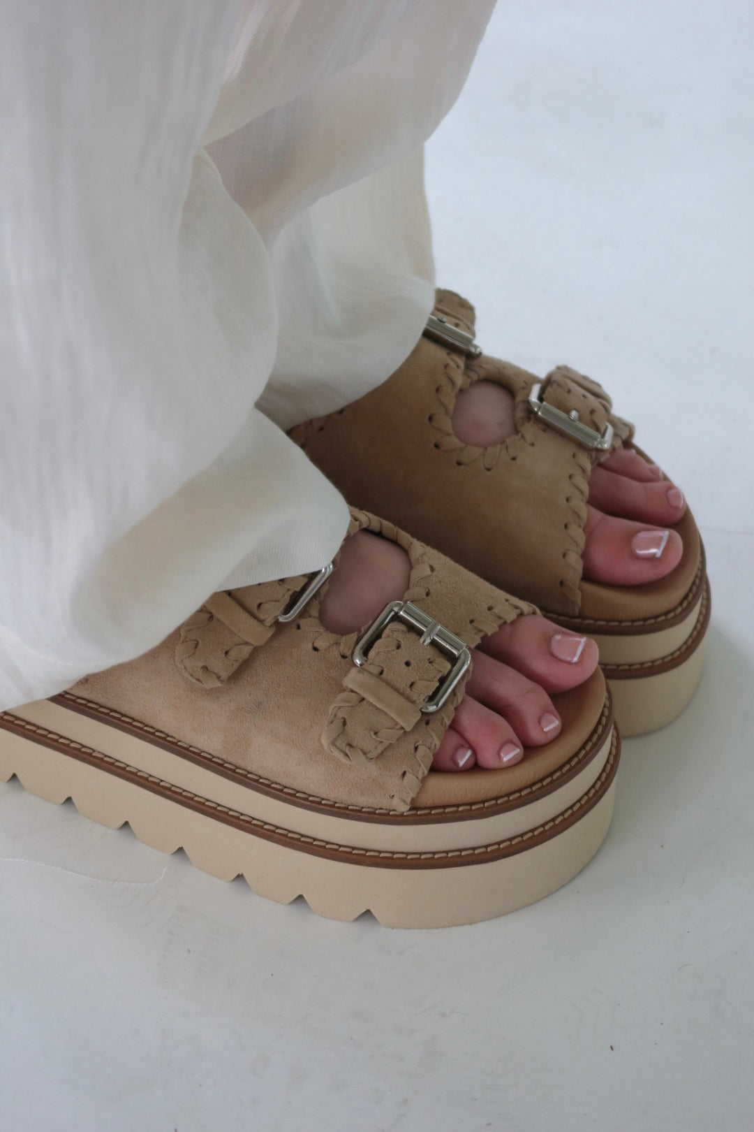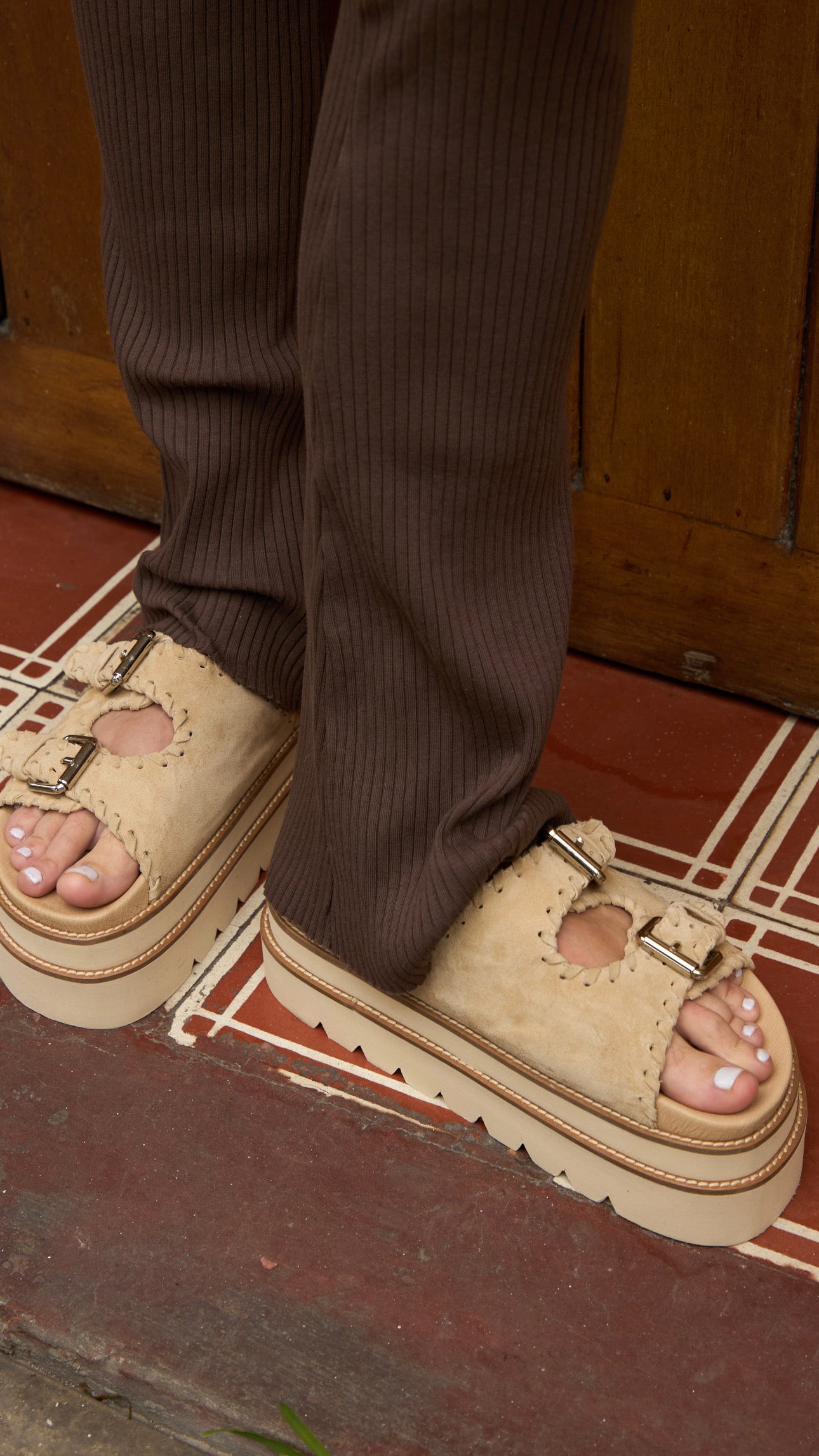 Sandalia de plataforma de 7 cm con capellada hecho en 100% cuero textura gamuza detalles de pasador en cuero liso en color vainilla.
