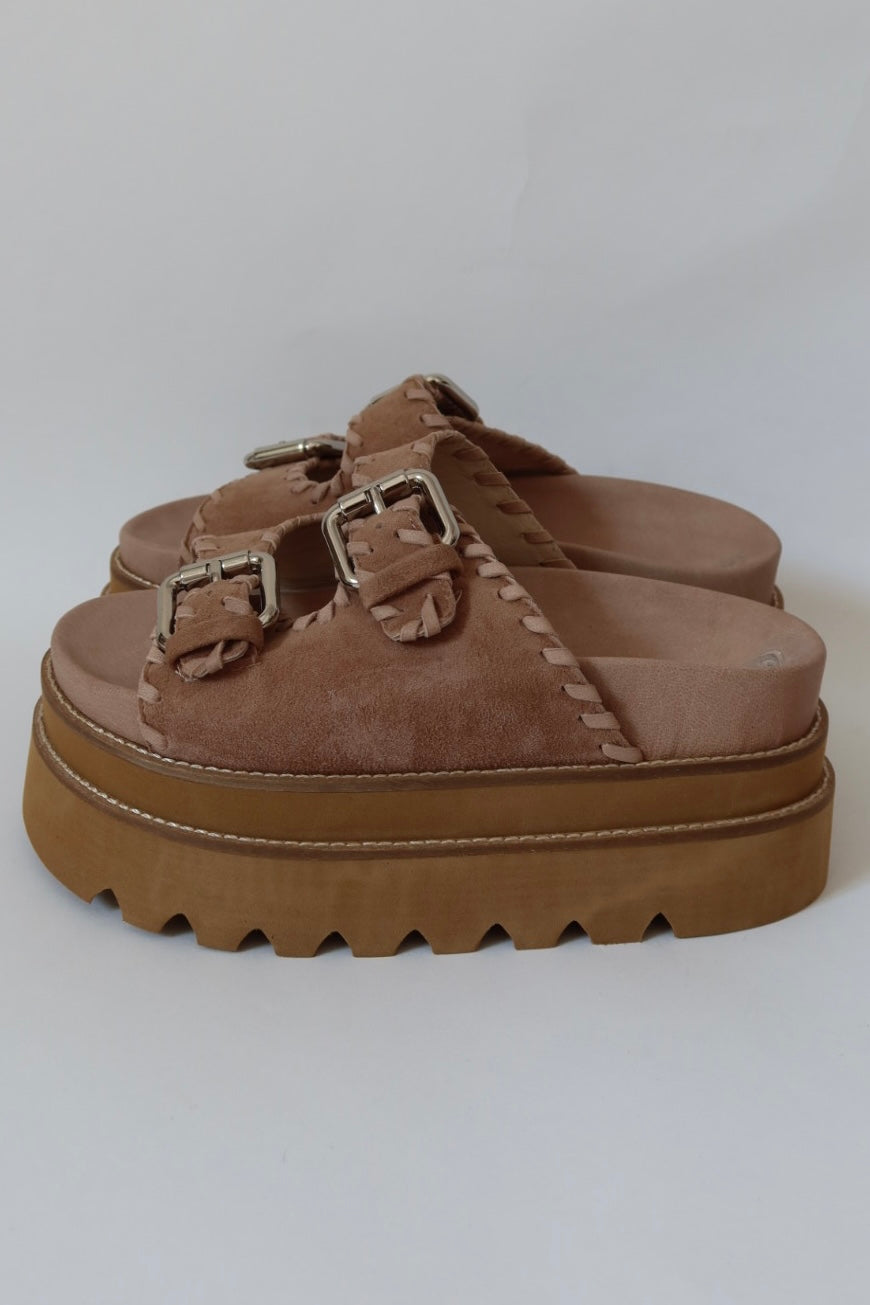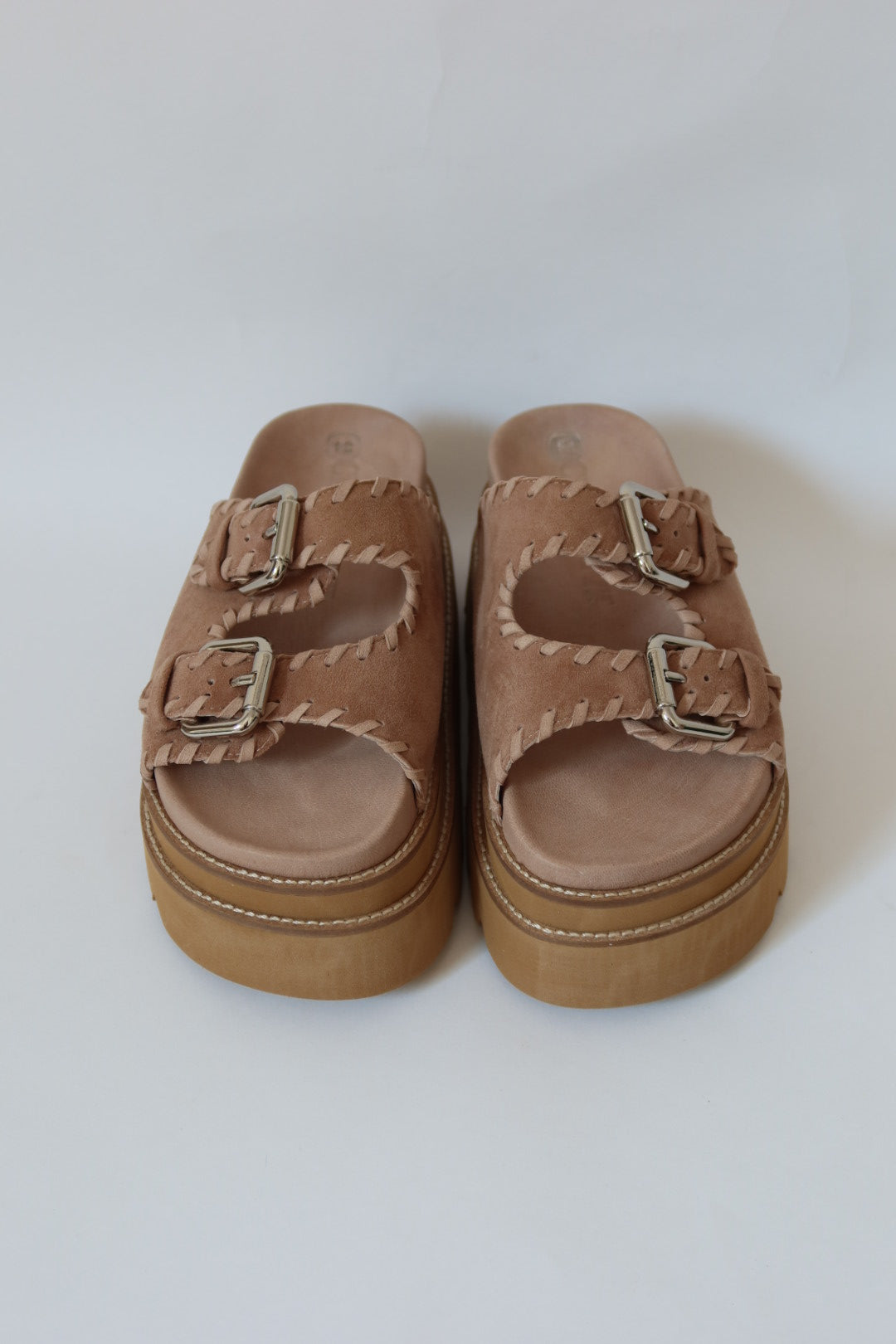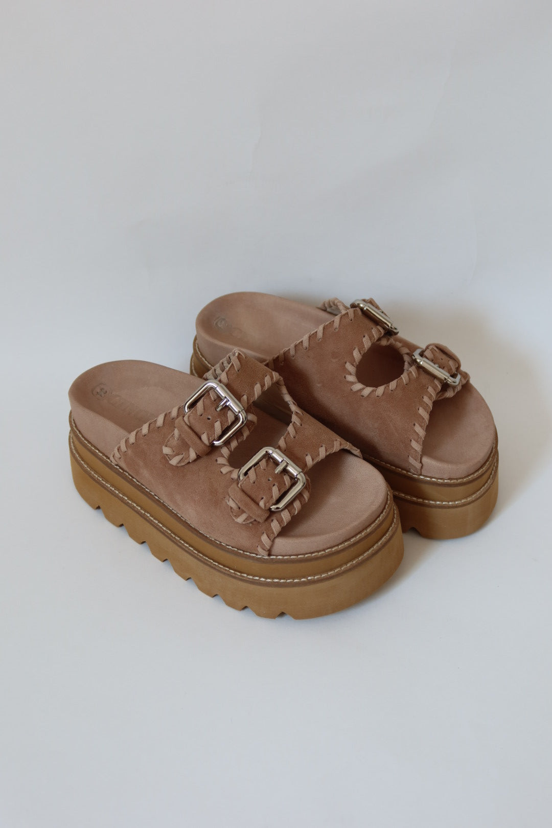 Sandalia de plataforma de 8 cm con capellada hecho en 100% cuero textura gamuza detalles de pasador en cuero liso.