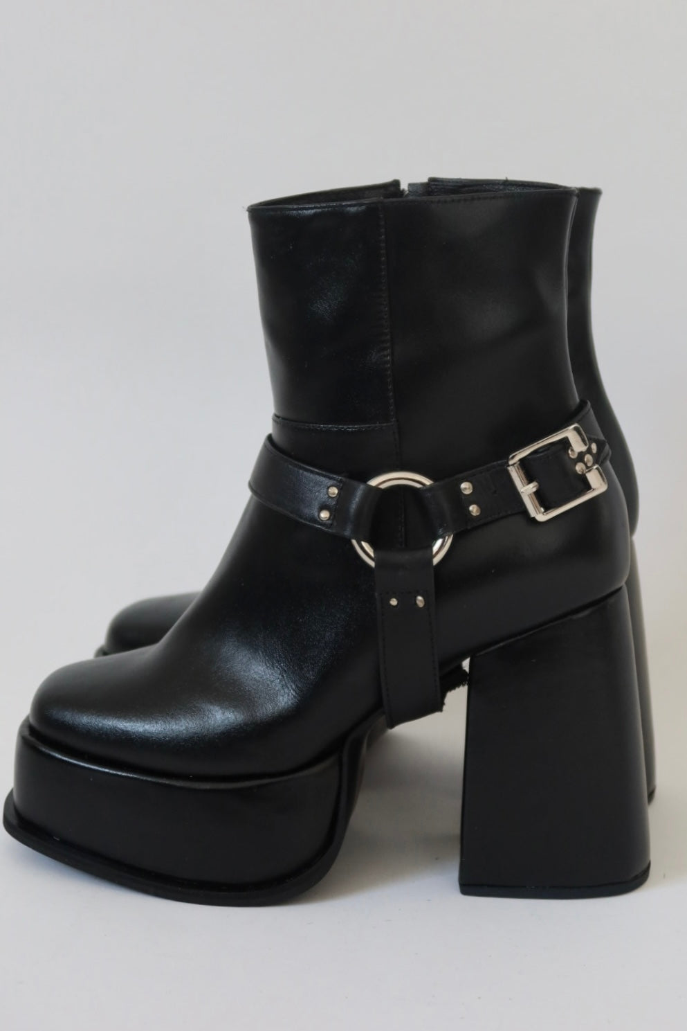 Nuestras chunky boots con accesorio finos hechas en 100% cuero con plataforma 5cm y taco 13cm.