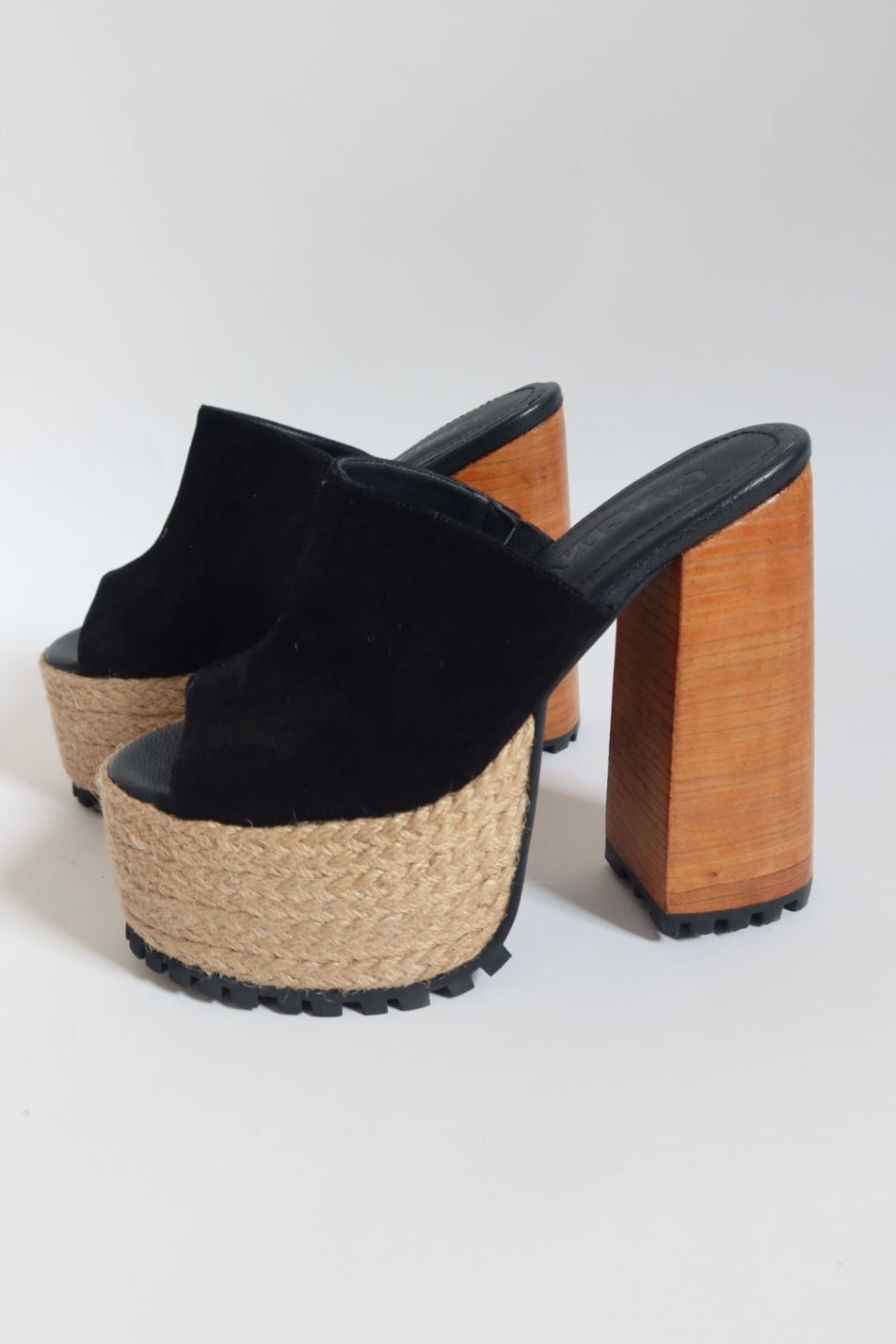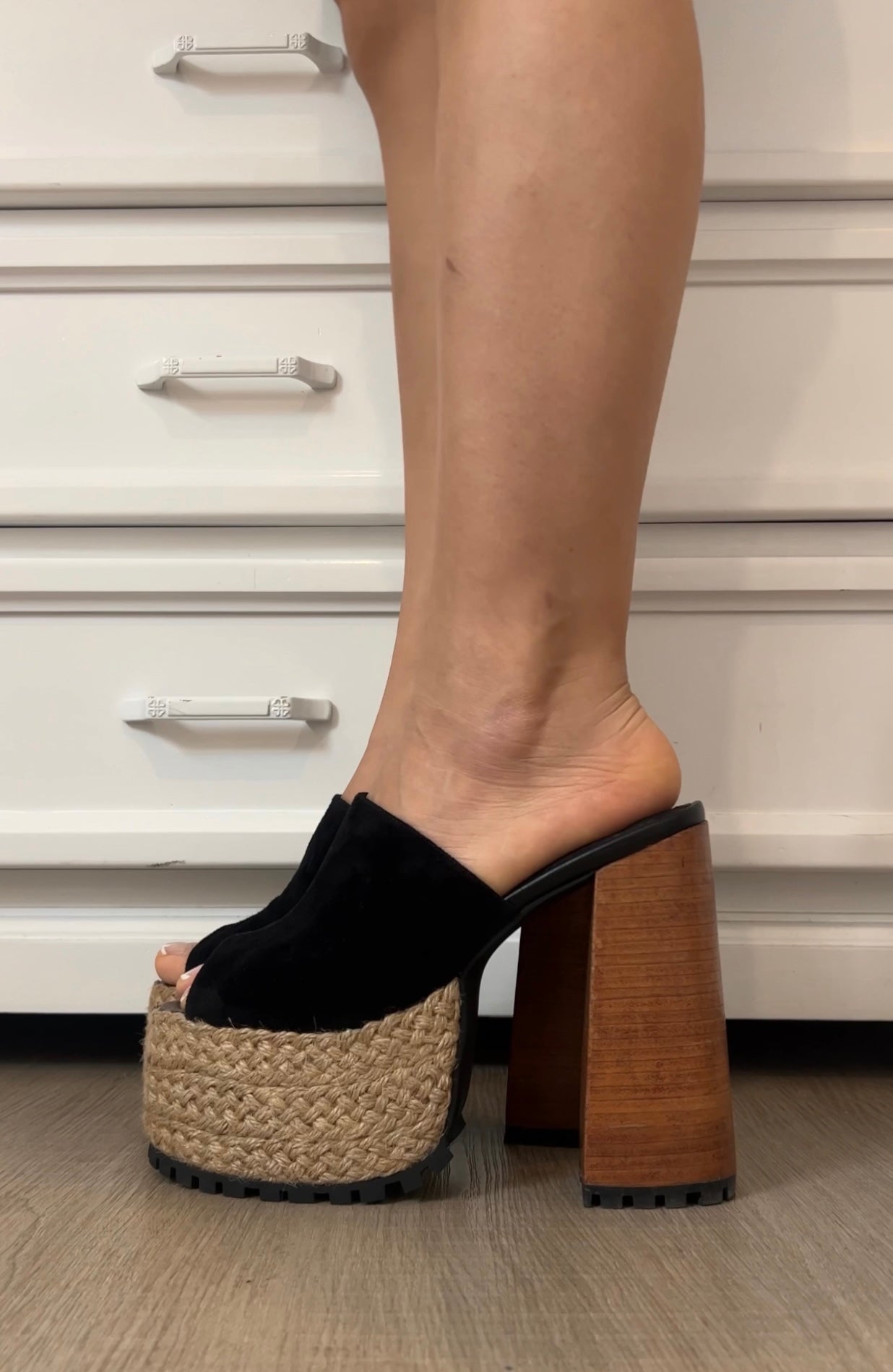 Tacos con plataforma forrado en yute, capellada hecho en cuero textura gamuza color manteca con huella tractor.