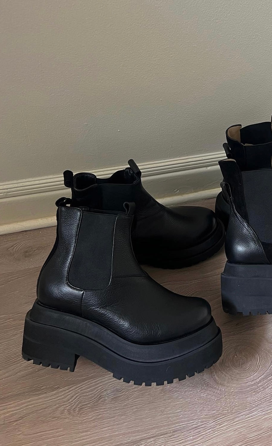 Botines clásicos y básicos de plataforma alta, hechas en cuero textura graneada interior y exterior.