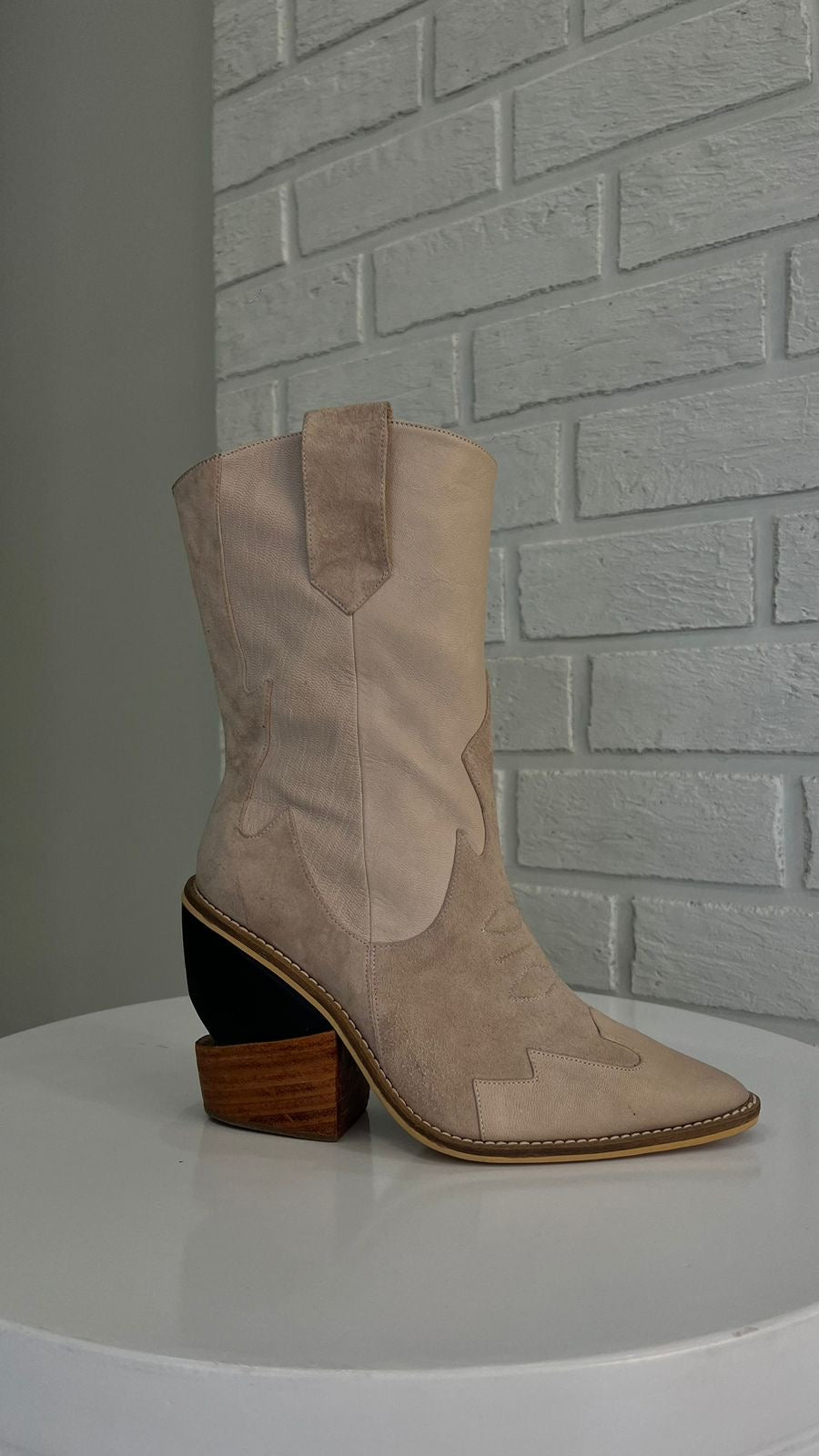 Nuestras texanas hechas en cuero gamuza vainilla y cuero liso al mismo tono, con un taco 9 y quiebre perfecto.