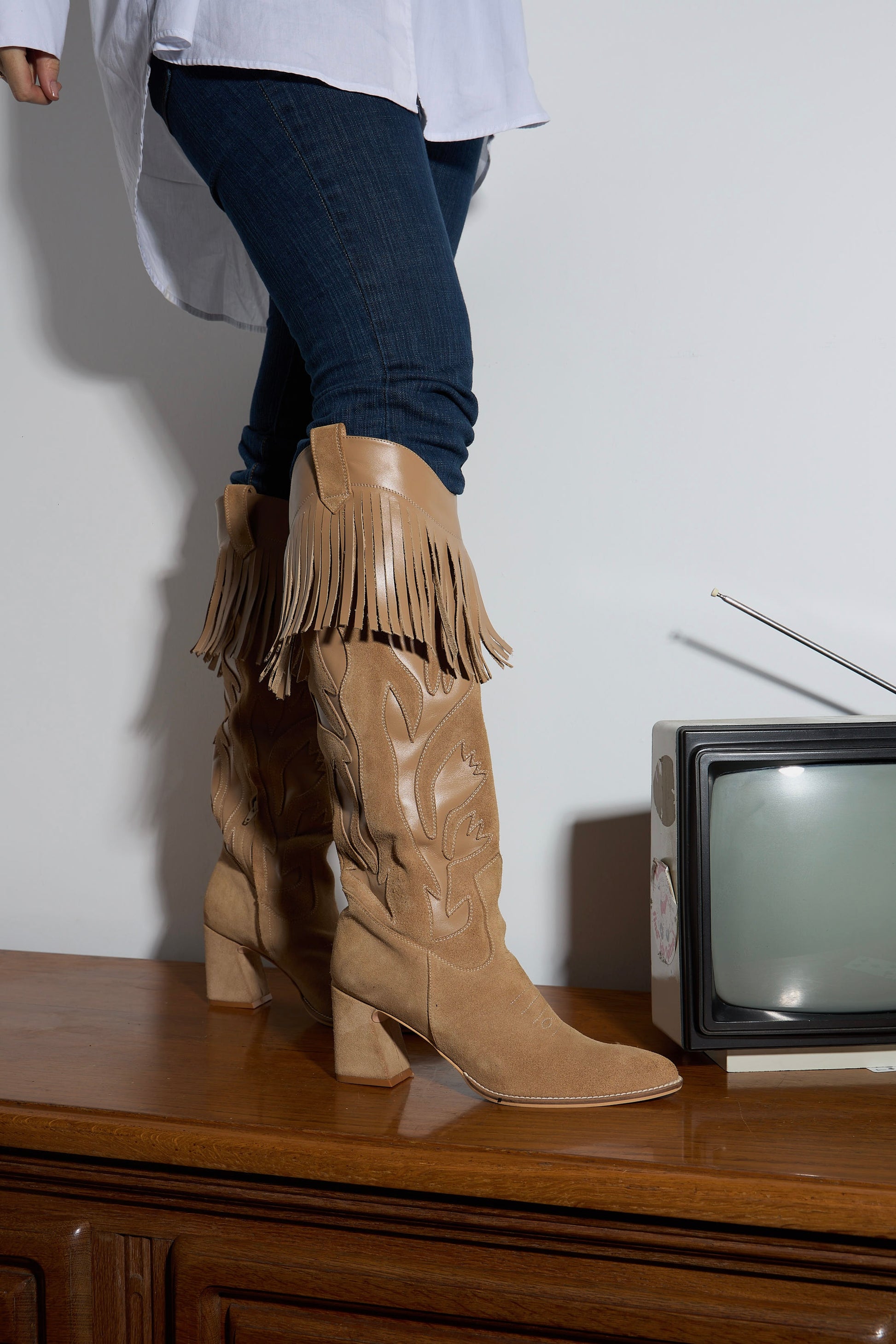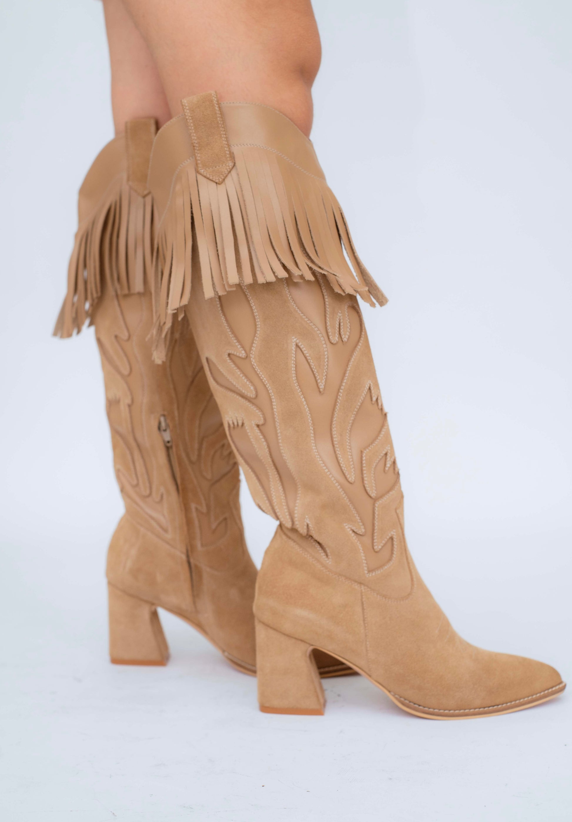 Nuestras texanas boho con un toque trendy de la temporada, hecho en gamuza cuero color vainilla y con detalles en el estampado y fleco en cuero liso al tono.